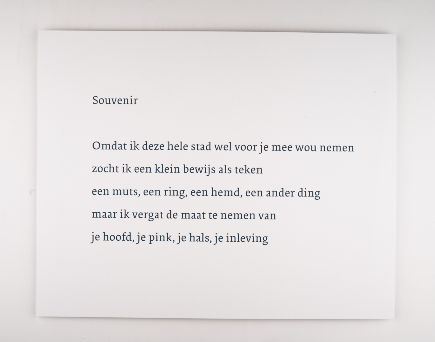 Het gedicht wordt verkocht zonder lijst, maar uiteraard helpen we je graag verder met opties van onze lijstenmaker.
